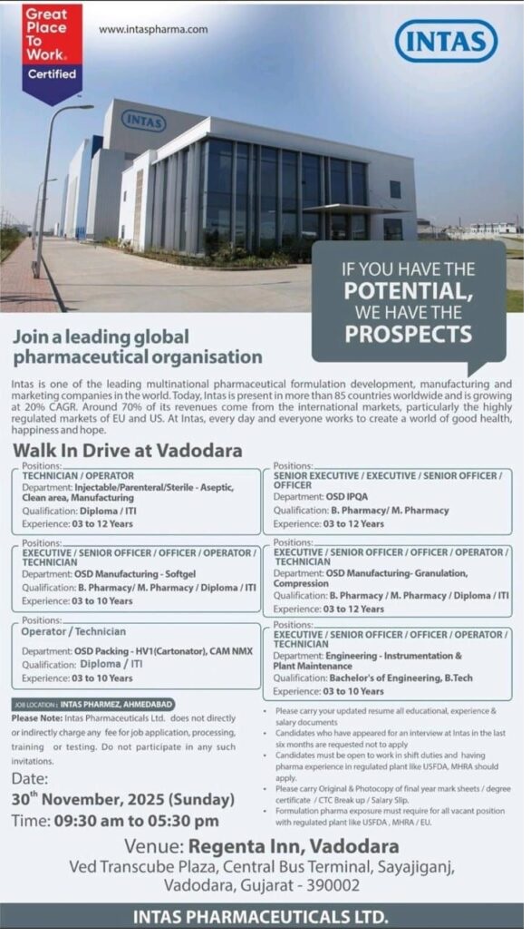Intas Pharma-Walk In Drive for B.Pharm, M.Pharm candidates in IPQA, Manufacturing on 30th November, 2025
