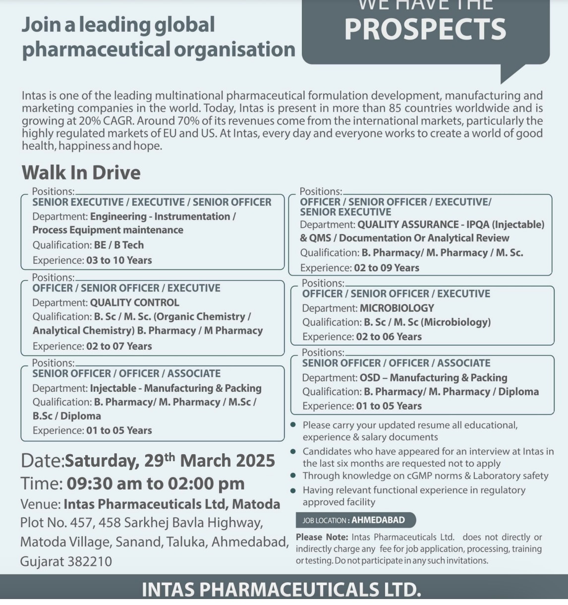 Intas- Pharma Walk In Drive On 29th March 2025 Intas- Pharma Walk In Drive On 29th March 2025 Post Views: 679 Job Category: Pharma Job Type: Full Time Job Location: Ahmedabad Apply for this position Full Name *Email *Phone *Cover Letter *Upload CV/Resume *Allowed Type(s): .pdf, .doc, .docxBy using this form you agree with the storage and handling of your data by this website. *