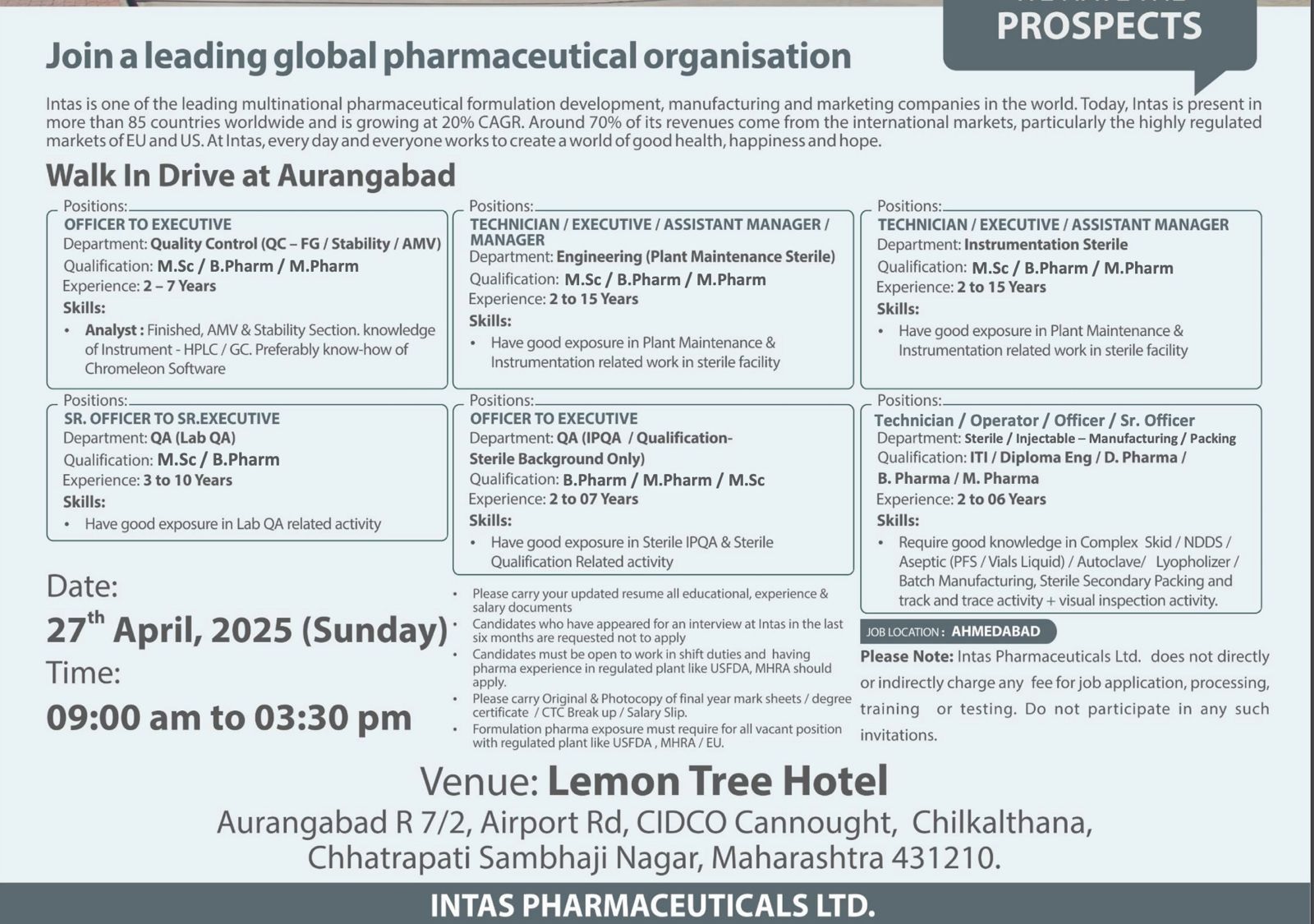 Intas Pharma-Walk in Drive for M.Pharm, B.Pharm, MSc in Multiple Department on 27 April, 2025@Sambhaji Nagar (Aurangabad)