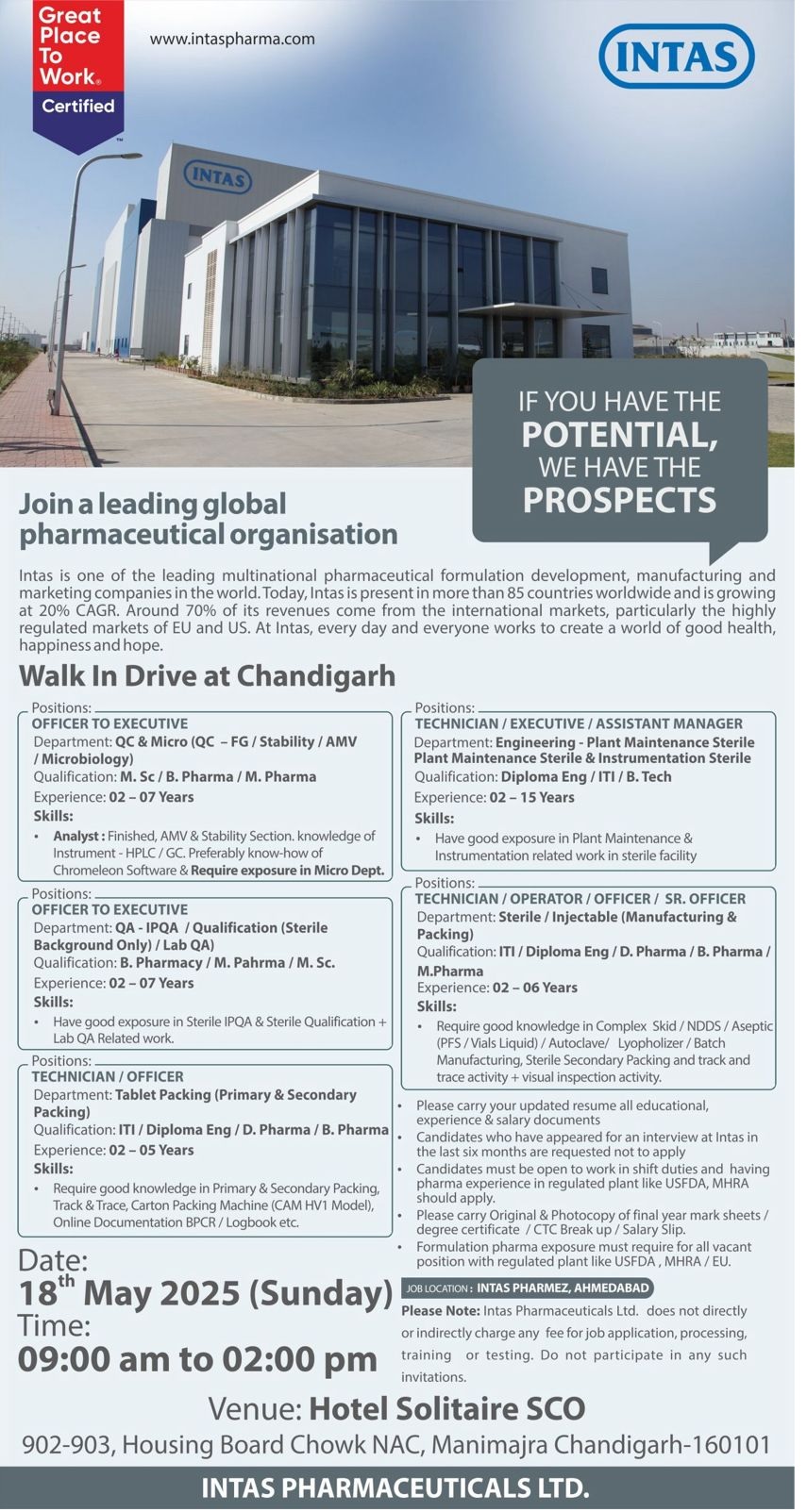 • Candidates who have appeared for an interview at Intas in the last six months are requested not to apply
