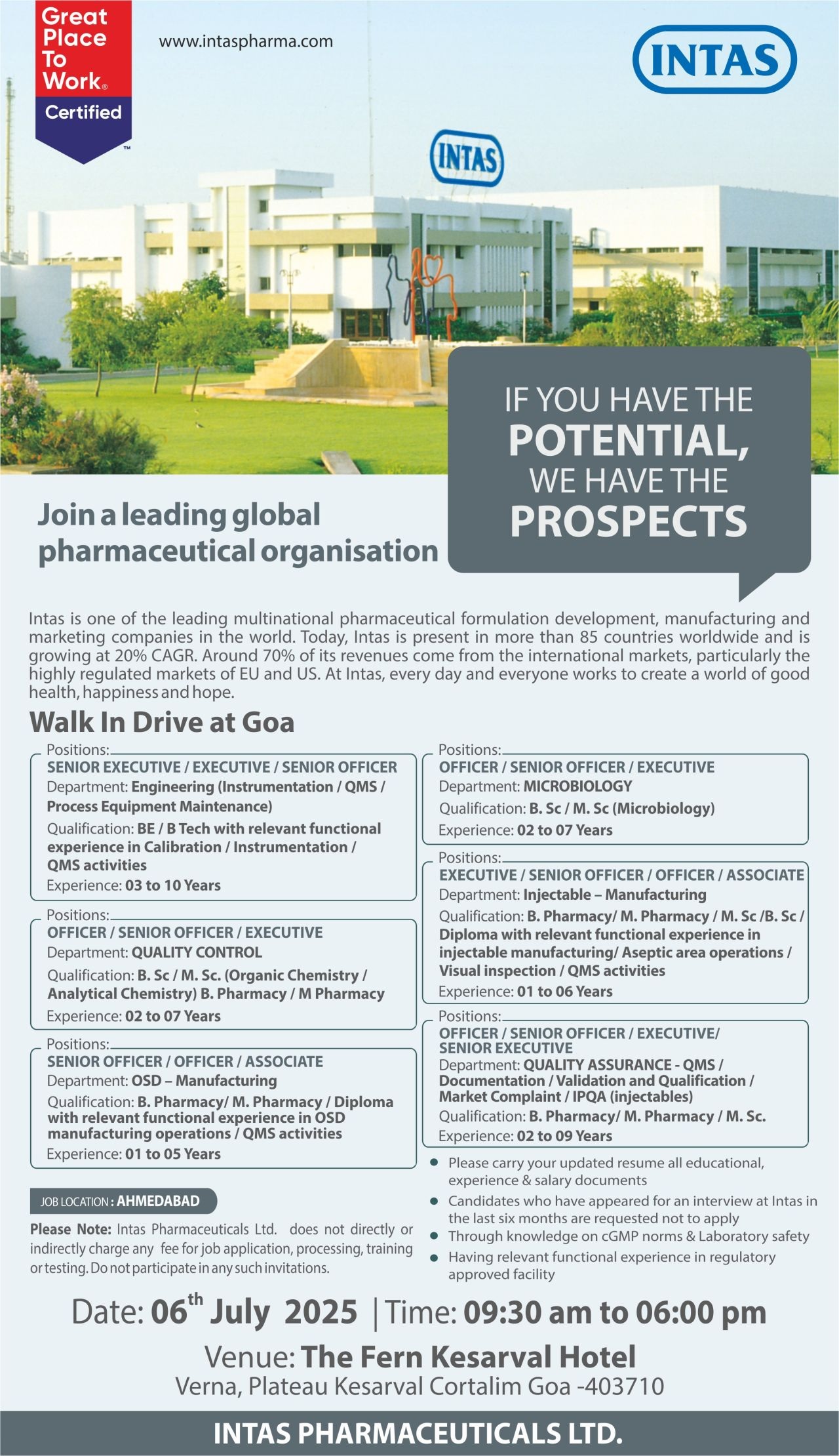 • Candidates who have appeared for an interview at Intas in the last six months are requested not to apply