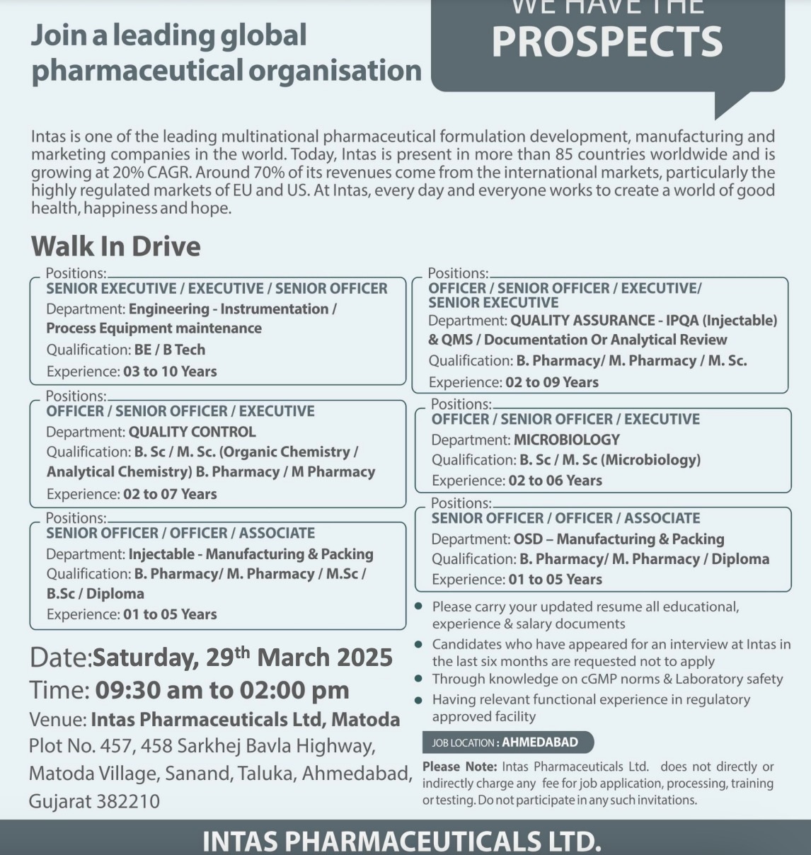 Intas Pharma -Walk In Drive On 29th 2025 Intas Pharma -Walk In Drive On 29th 2025 Post Views: 864 Job Category: Pharma Job Type: Full Time Job Location: Ahmedabad Apply for this position Full Name *Email *Phone *Cover Letter *Upload CV/Resume *Allowed Type(s): .pdf, .doc, .docxBy using this form you agree with the storage and handling of your data by this website. *