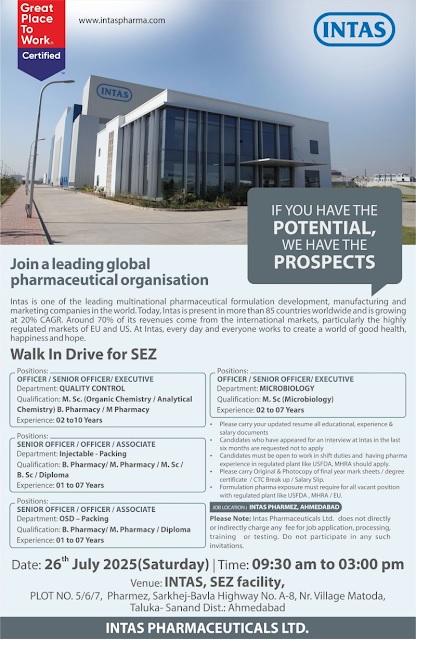 Intas Pharma -Walk in Interview for B.sc / M.sc / B.Pharm / M.Pharm / Diploma On 26th July 2025@ Ahmedabad
