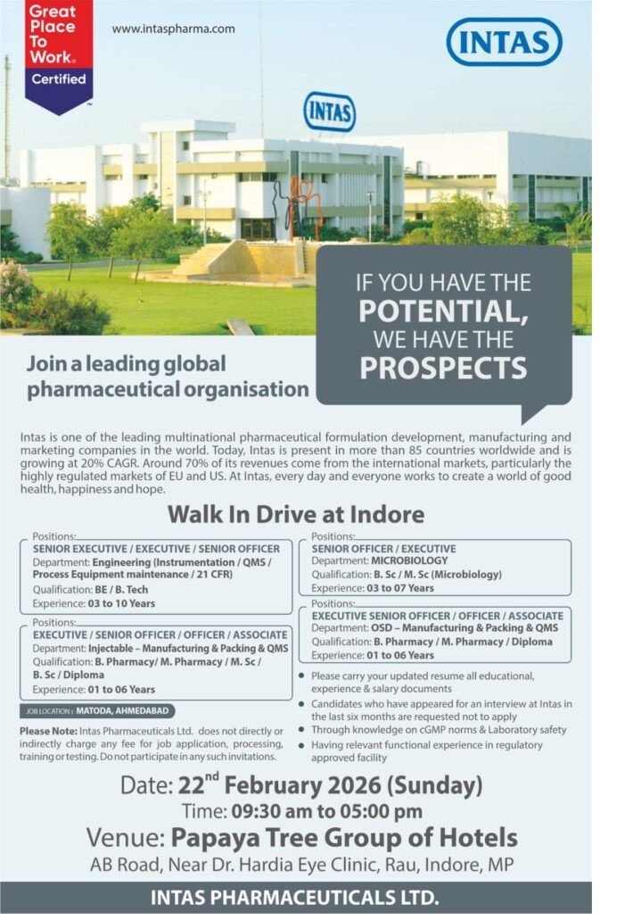 Intas Pharmaceuticals-Walk-In Drive for Engineering, Microbiology & Manufacturing on 22nd February 2026 @ Indore