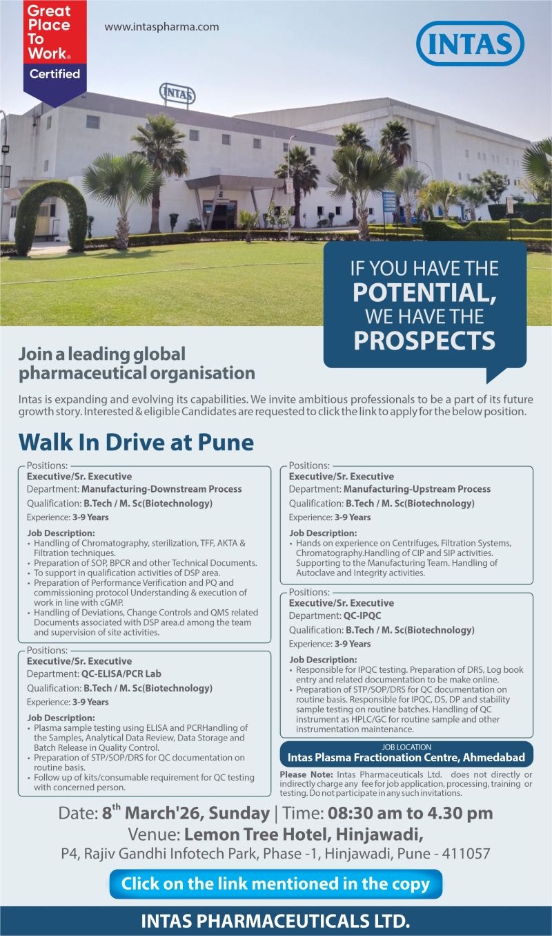 Intas Pharmaceuticals- Walk In Drive for Manufacturing & QC Biotech on 8th March 2026@Pune