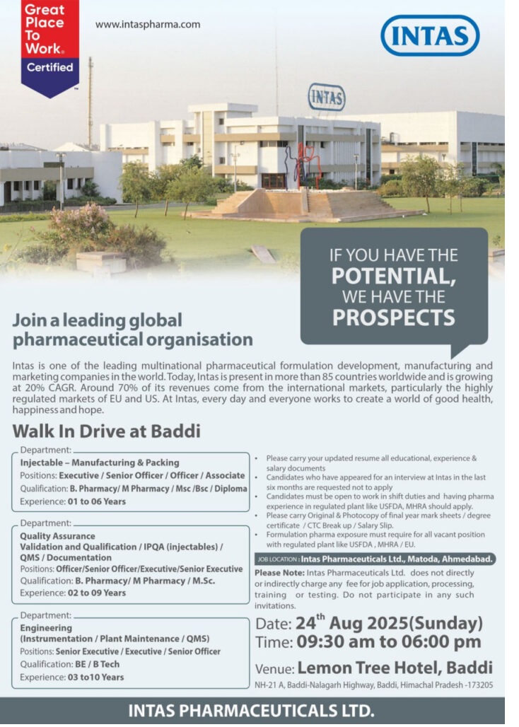 Intas Pharmaceuticals -Walk-in Drive for Manufacturing, QA & Engineering on 24th August 2025@ Baddi