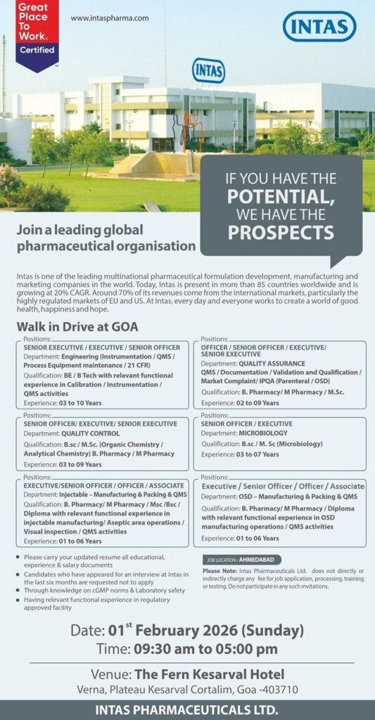 Qualification: B.Pharmacy / M.Pharmacy / M.Sc.