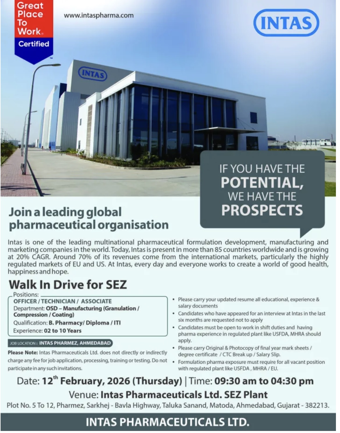 Intas Pharmaceuticals- Walk In Interview OSD Manufacturing12th February 2026@  SEZ Ahmedabad