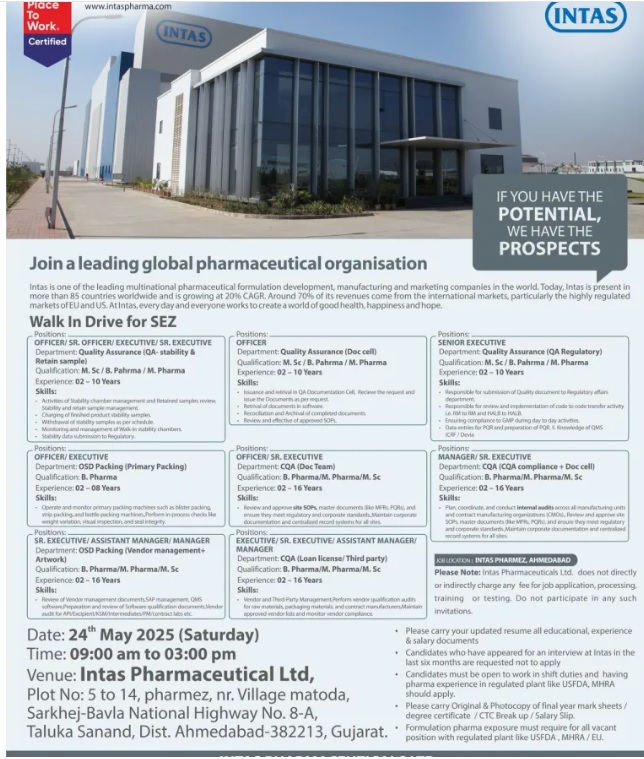 Please Note: Intas Pharmaceuticals Ltd. does not directly or indirectly charge any fee for job application, processing training or testing. Do not participate in any such invitations.