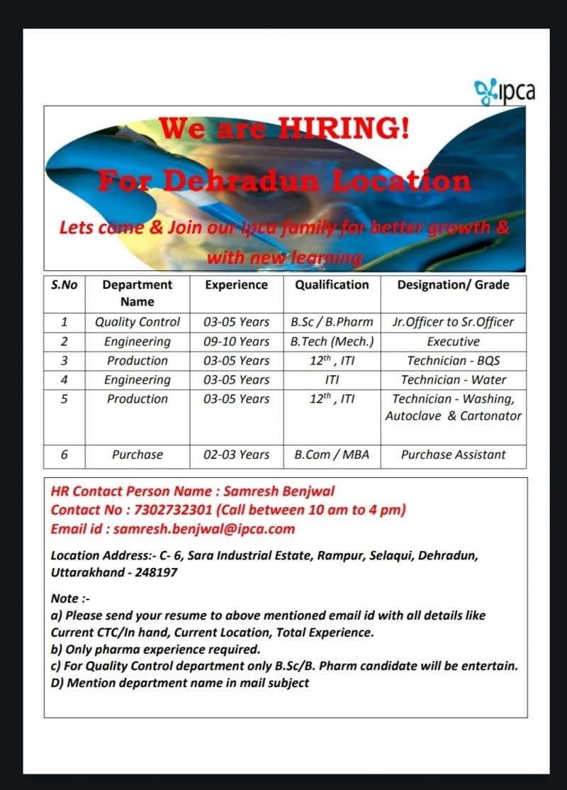 Ipca- Hiring For QC/ Engineering and Production Dept