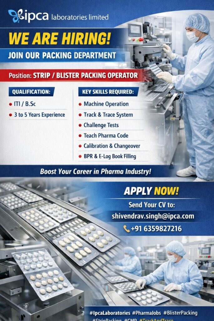 Ipca Laboratories- Hiring Strip and Blister Packing Operators Ipca Laboratories- Hiring Strip and Blister Packing Operators Post Views: 55 Job Category: Pharma Job Type: Full Time Job Location: INDIA Apply for this position Full Name *Email *Phone *Cover Letter *Upload CV/Resume *Allowed Type(s): .pdf, .doc, .docxBy using this form you agree with the storage and handling of your data by this website. *