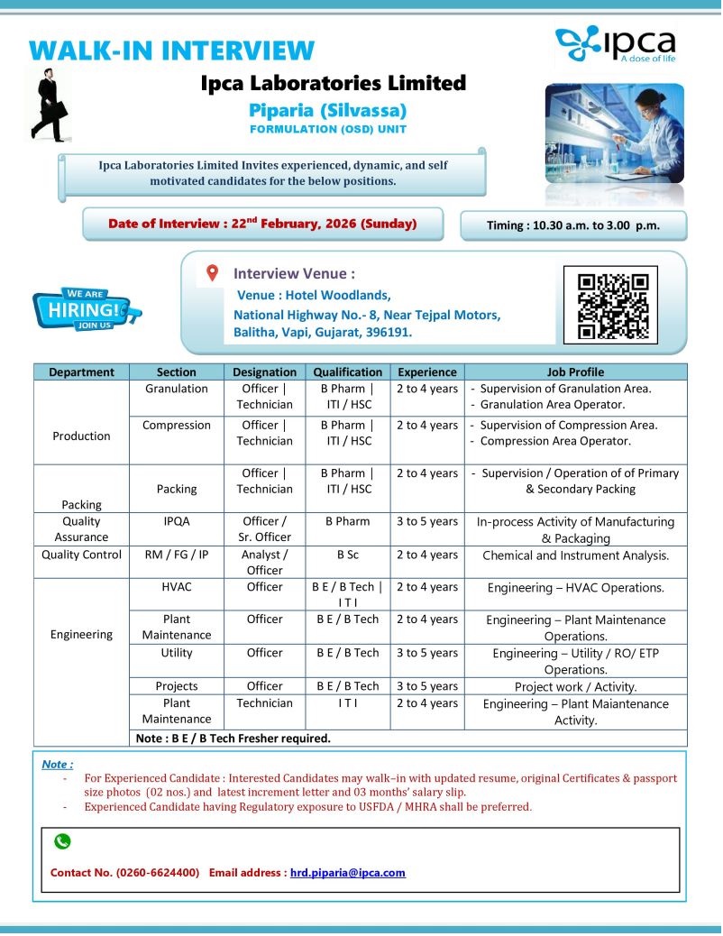 Ipca Laboratories-Interview for Production, Packing, QA, QC on 22nd February, 2026