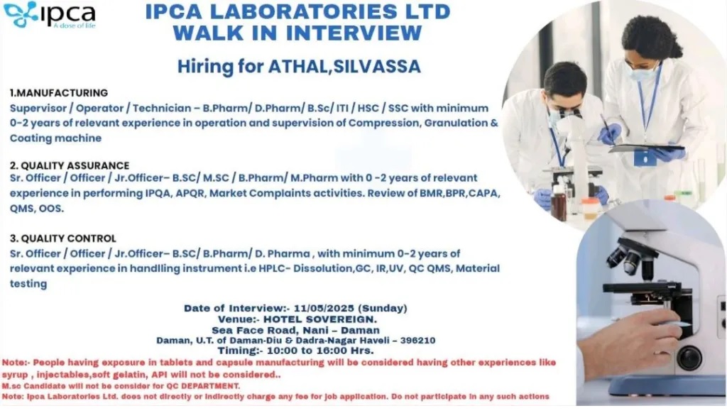 1.MANUFACTURING Supervisor/Operator/Technician – B.Pharm/ D.Pharm/ B.Sc/ITI/HSC / SSC with minimum 0-2 years of relevant experience in operation and supervision of Compression, Granulation & Coating machine 2. QUALITY ASSURANCE Sr. Officer/Officer/Jr.Officer-B.SC/ M.SC/B.Pharm/ M.Pharm with 0-2 years of relevant experience in performing IPQA, APQR, Market Complaints activities. Review of BMR,BPR,CAPA, QMS, OOS. 3. QUALITY CONTROL Sr. Officer/Officer/Jr.Officer-B.SC/ B.Pharm/ D. Pharma, with minimum 0-2 years of relevant experience in handlling instrument i.e HPLC- Dissolution, GC, IR,UV, QC QMS, Material testing Date of Interview:- 11/05/2025 (Sunday) Venue:- HOTEL SOVEREIGN. Sea Face Road, Nani – Daman Daman, U.T. of Daman-Diu & Dadra-Nagar Haveli – 396210 Timing: 10:00 to 16:00 Hrs. Note:- People having exposure in tablets and capsule manufacturing will be considered having other experiences like syrup, injectables, soft gelatin, API will not be considered.. M.sc Candidate will not be consider for QC DEPARTMENT. Note: Ipca Laboratories Ltd. does not directly or indirectly charge any fee for job application. Do not participate in any such actions