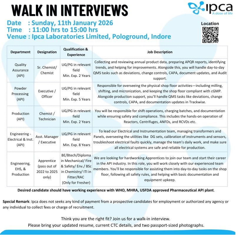 Ipca Laboratories-Walk in for QA, Production, Powder Processing on 11th January 2026