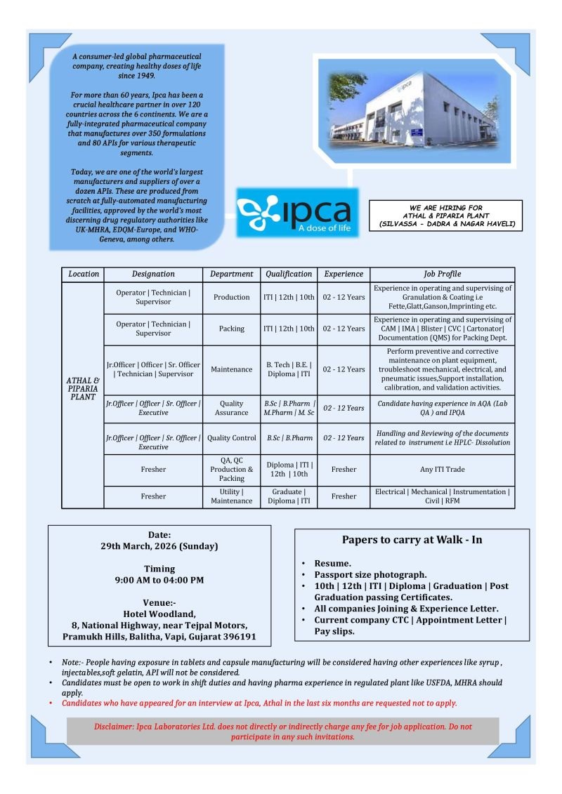 • Candidates who have appeared for an Interview at Ipca, Athal in the last six months are requested not to apply.