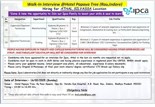 Ipca Laboratories-Walk In Drive for D.Pharm, B.Pharm, M.Pharm in Manufacturing, Packing on 16/02/2025