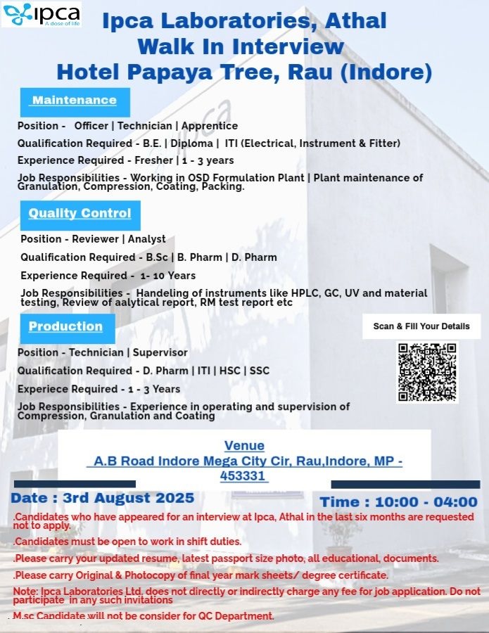 Ipca Laboratories Walk-In Interview For Maintenance, QC & Production on 3rd August 2025