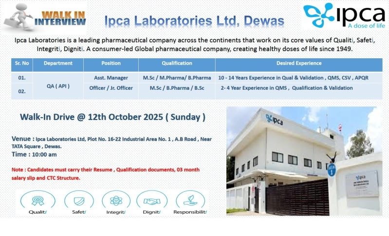 Ipca Laboratories- Walk In Interview For QA (API) on October 12, 2025