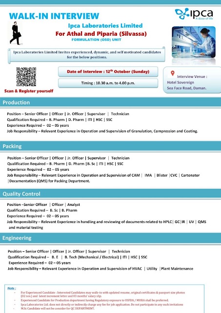 Ipca Laboratories- Walk In Interview For Production/ Packing/ QC & Engineering on12th October 2025