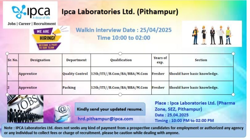 Note: IPCA Laboratories Ltd. does not seeks any kind of payment from a prospective candidates for employment or authorized any agency or any individual to collect fees or charge of recruitment. please be caution while dealing with anyone.