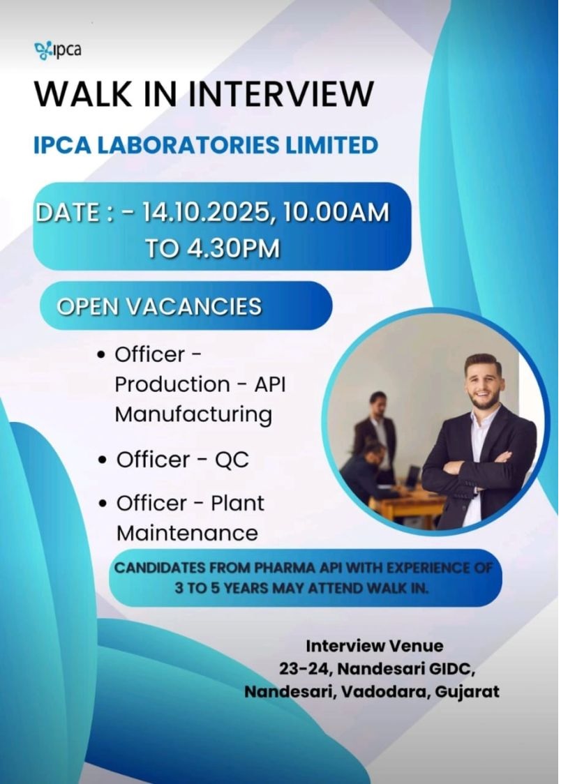 Ipca Laboratories- Walk In Interview For Production, QC & Maintenance on October 14, 2025 Ipca Laboratories- Walk In Interview For Production, QC & Maintenance on October 14, 2025 Post Views: 442 Job Category: Pharma Job Type: Full Time Job Location: Gujarat Apply for this position Full Name *Email *Phone *Cover Letter *Upload CV/Resume *Allowed Type(s): .pdf, .doc, .docxBy using this form you agree with the storage and handling of your data by this website. *