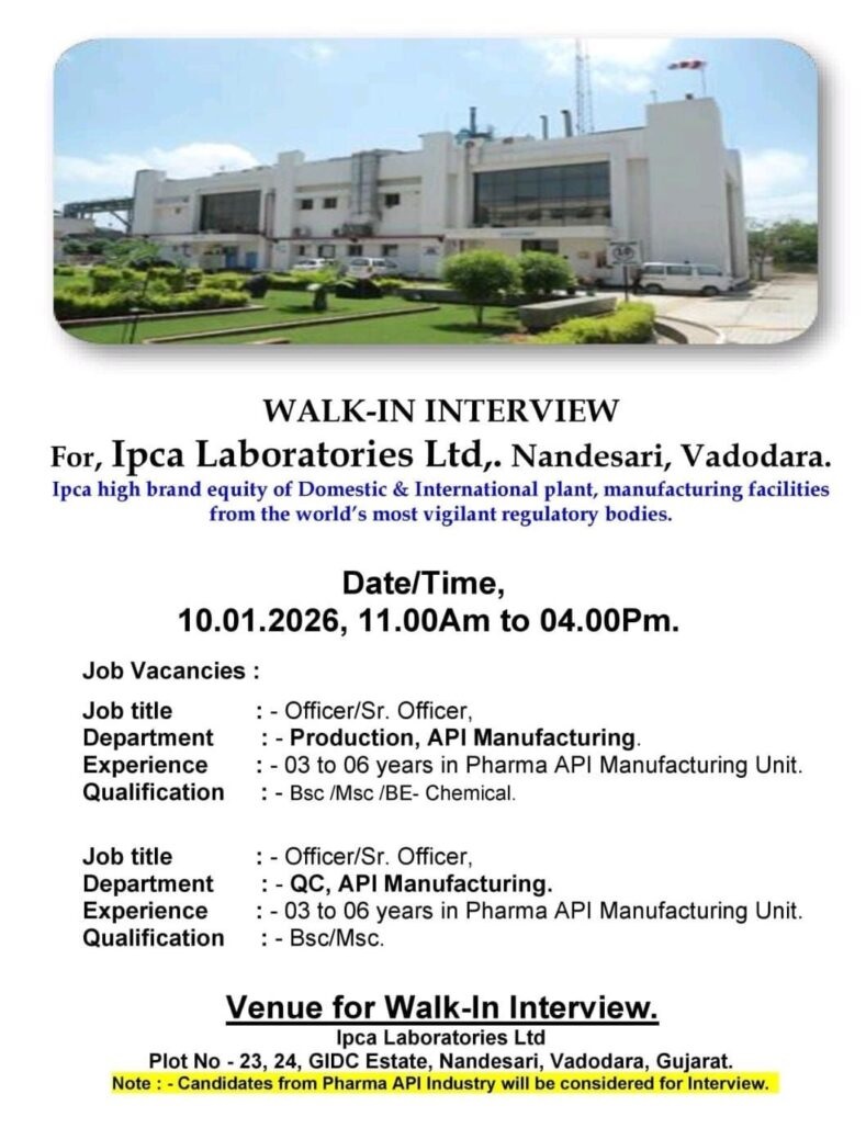 Ipca Laboratories- Walk-In Interview – API Manufacturing on January 10, 2026 @Vadodara Ipca Laboratories- Walk-In Interview – API Manufacturing on January 10, 2026 @Vadodara Post Views: 373 Job Category: Pharma Job Type: Full Time Job Location: Vadodara (Gujarat). Apply for this position Full Name *Email *Phone *Cover Letter *Upload CV/Resume *Allowed Type(s): .pdf, .doc, .docxBy using this form you agree with the storage and handling of your data by this website. *
