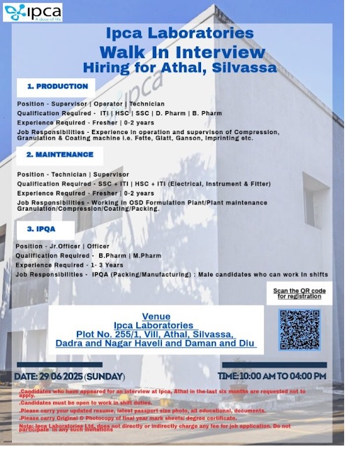 Ipca Laboratories Walk In Interview ON 29/06/2025
