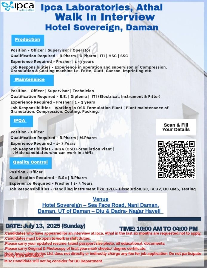 Ipca Laboratories- Walk In Interview For Production, Maintenance, IPQA & QC on July 13, 2025