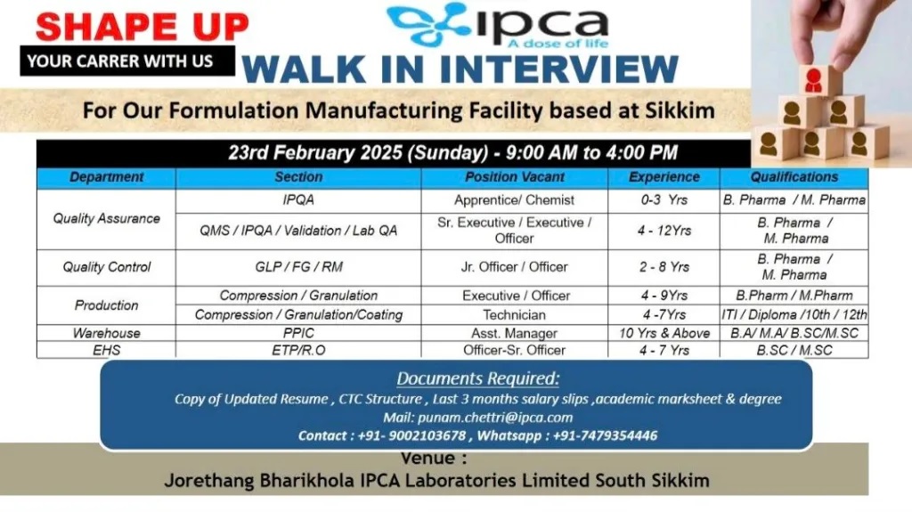 IPCA Laboratories-Walk-in Interview on 23rd February 2025 @South Sikkim