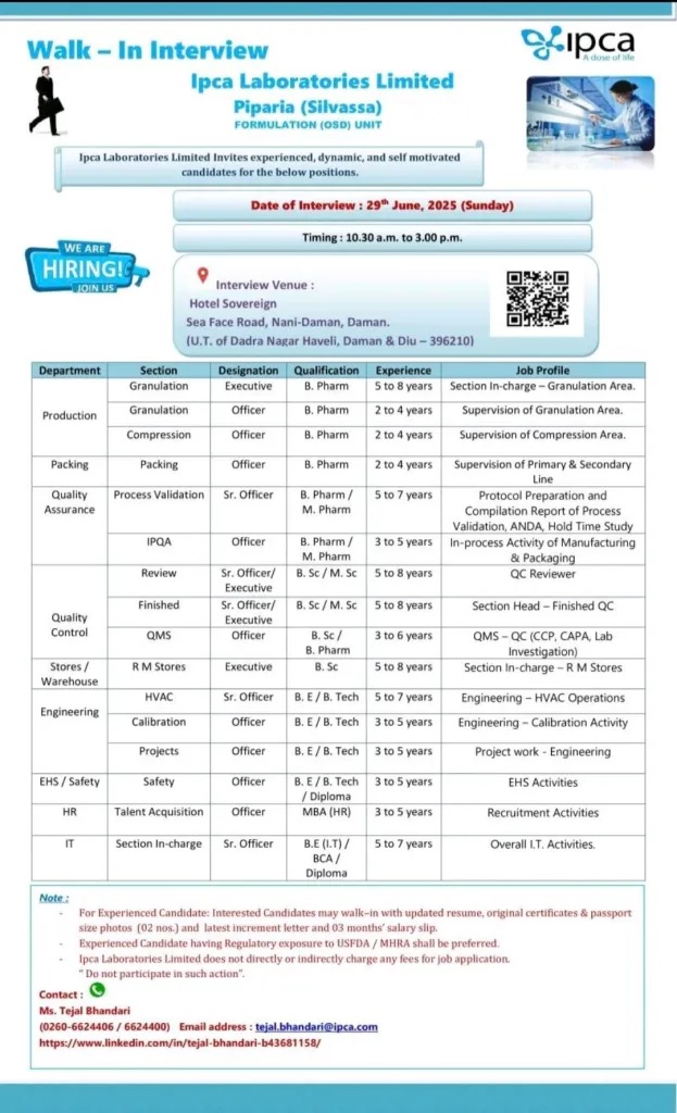 Ipca Laboratories Limited Invites experienced, dynamic, and self motivated candidates for the below positions.