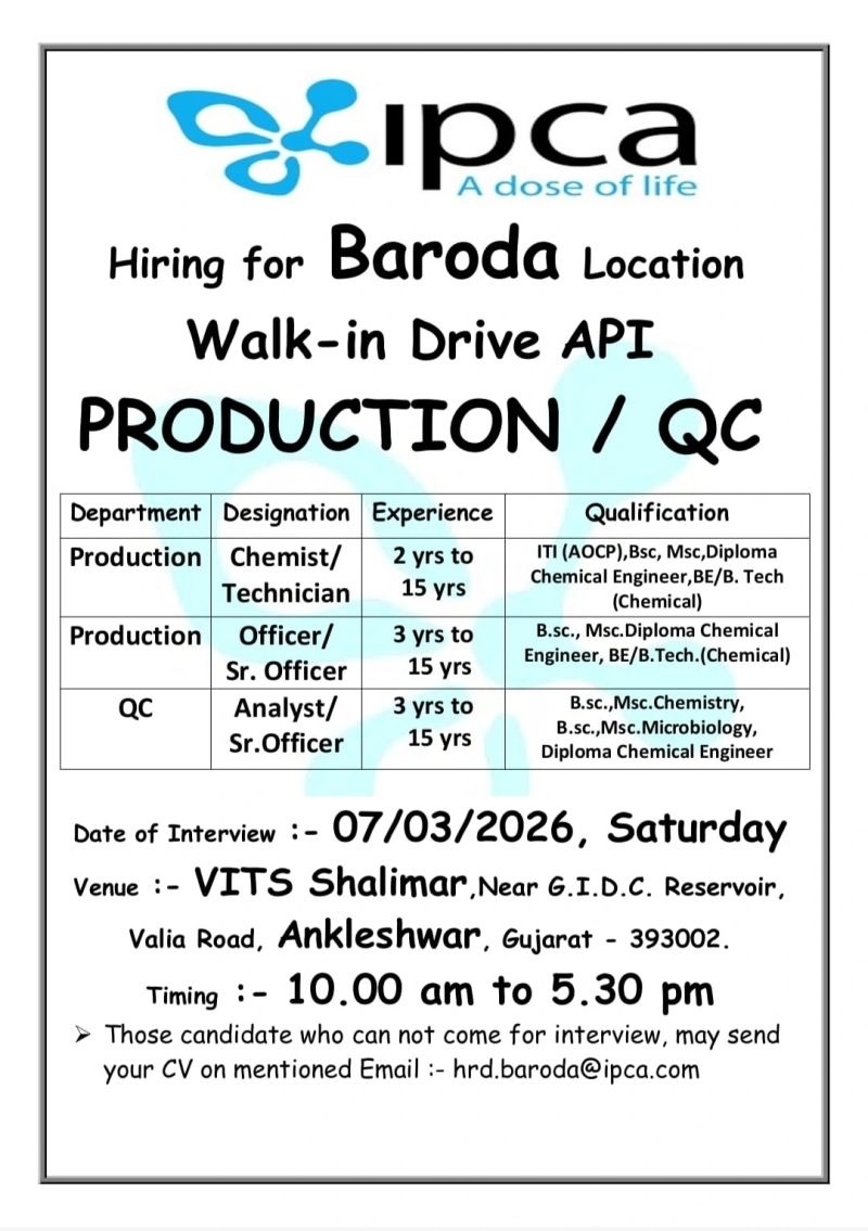 Ipca -Walk-In Drive for API Production & QC on 07/03/2026@ Ankleshwar Gujarat Ipca -Walk-In Drive for API Production & QC on 07/03/2026@ Ankleshwar Gujarat Post Views: 179 Job Category: Pharma Job Type: Full Time Job Location: baroda Apply for this position Full Name *Email *Phone *Cover Letter *Upload CV/Resume *Allowed Type(s): .pdf, .doc, .docxBy using this form you agree with the storage and handling of your data by this website. *