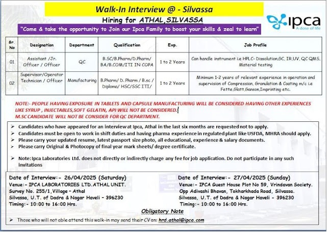 Ipca- Walk In Interview For QC and Manufacturing Dept on 26&27th April 2025