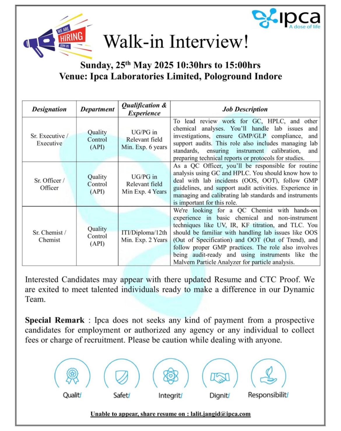 Ipca- Walk In Interview For Quality Control Professionals on 25th May 2025