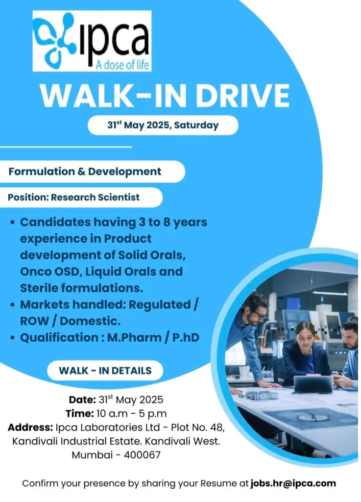 Ipca Laboratories Ltd, a leading pharmaceutical company, is organizing a walk-in drive for experienced professionals in Formulation & Development. The company is seeking talented Research Scientists to join its team and contribute to innovative product development.
