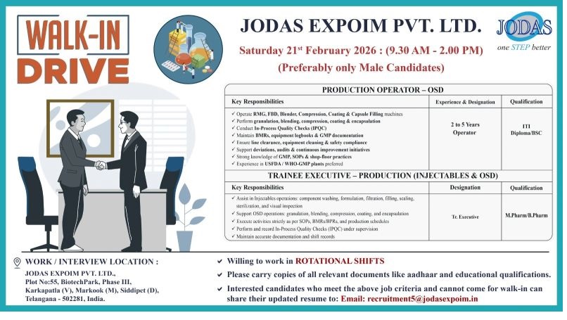 Jodas Expoim Pvt Ltd- Walk-In Drive Production Operator & Trainee Executive on 21st February 2026