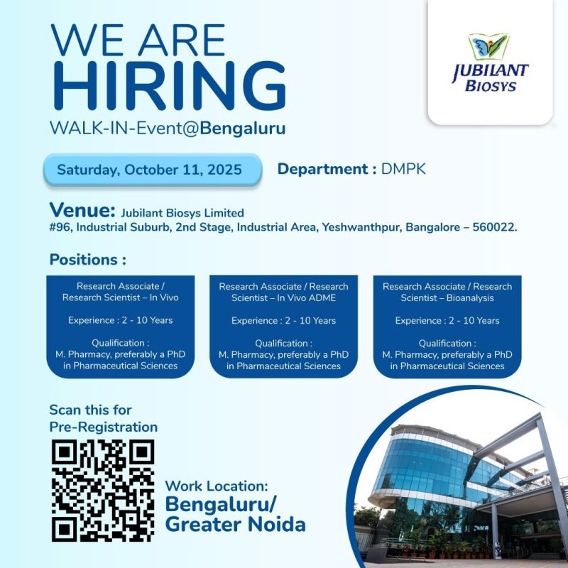 Jubilant Biosys-Walk In Interview For Research Associate/Research Scientist Positions on October 11, 2025 Jubilant Biosys-Walk In Interview For Research Associate/Research Scientist Positions on October 11, 2025 Post Views: 492 Job Category: Pharma Job Type: Full Time Job Location: Bengaluru Apply for this position Full Name *Email *Phone *Cover Letter *Upload CV/Resume *Allowed Type(s): .pdf, .doc, .docxBy using this form you agree with the storage and handling of your data by this website. *
