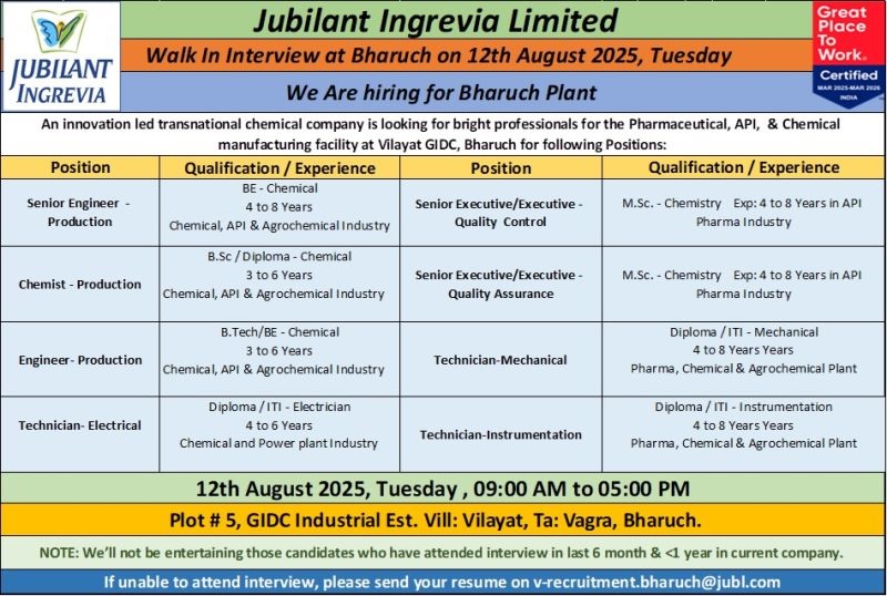 Jubilant Ingrevia Ltd- Walk in Interview For Production/ and Electrical/ QC/ QA/ Instrumentation/ Mechanical on 12th August 2025