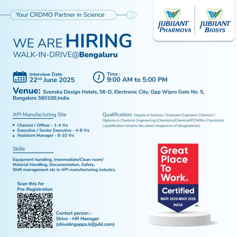 Jubilant Pharmova & Jubilant Biosys – Walk-In Drive on 22nd June 2025 @ Bengaluru Jubilant Pharmova & Jubilant Biosys – Walk-In Drive on 22nd June 2025 @ Bengaluru Post Views: 804 Job Category: Pharma Job Type: Full Time Job Location: Bengaluru Apply for this position Full Name *Email *Phone *Cover Letter *Upload CV/Resume *Allowed Type(s): .pdf, .doc, .docxBy using this form you agree with the storage and handling of your data by this website. *