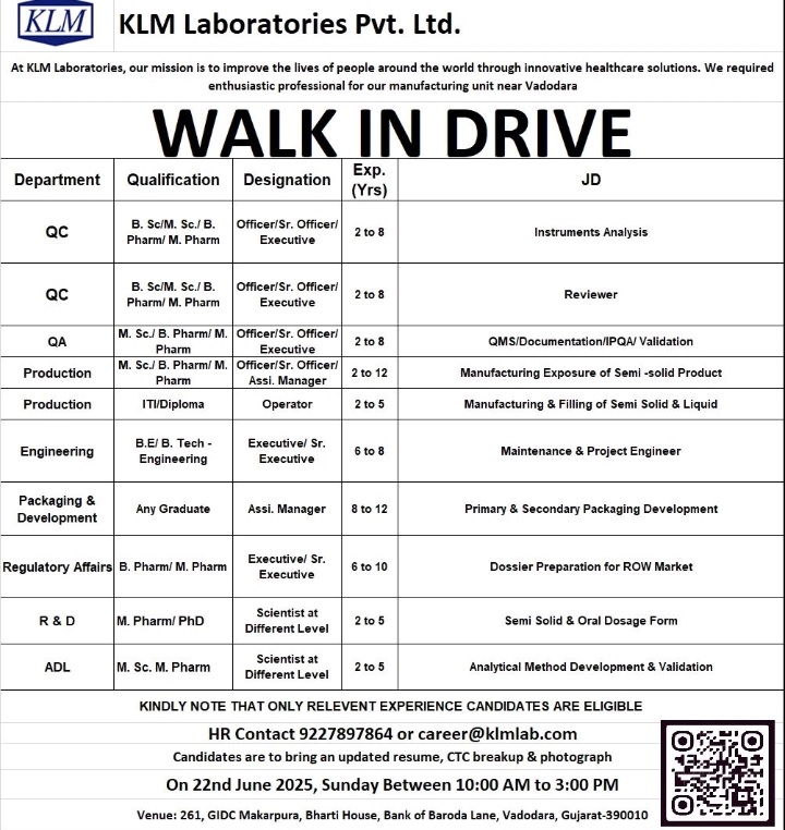 Qualification : B.Sc./M.Sc./ B. Pharm / M. Pharm
