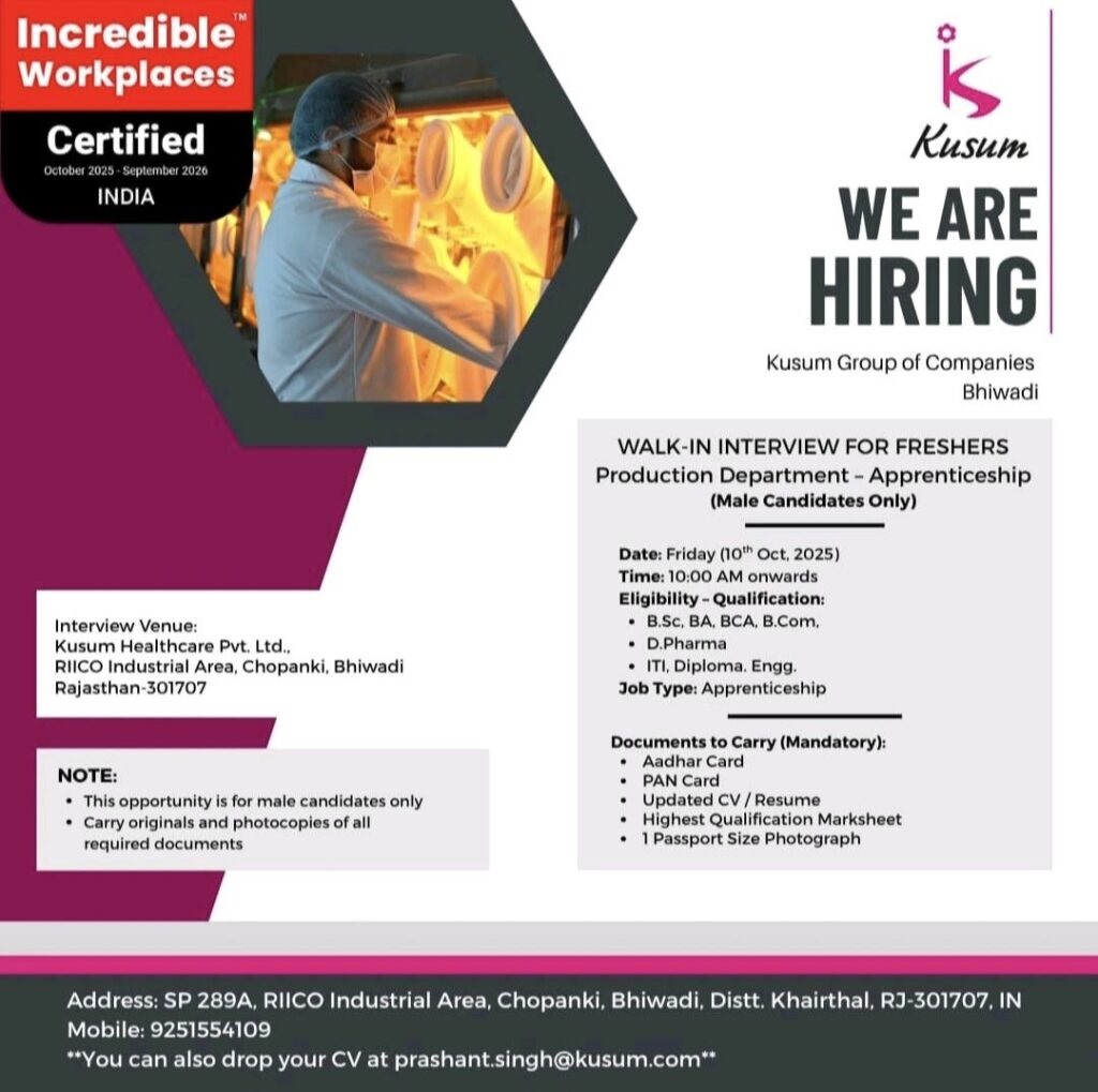 Kusum Healthcare- Walk-In Interview for Freshers in Production Apprenticeship on 10th Oct 2025@ Bhiwadi