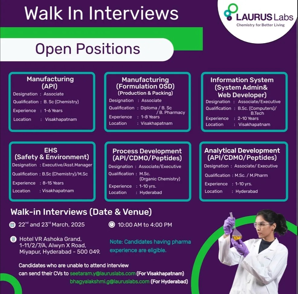 Laurus Labs -Walk-In Interview for Multiple Openings on 22 & 23 March 2025