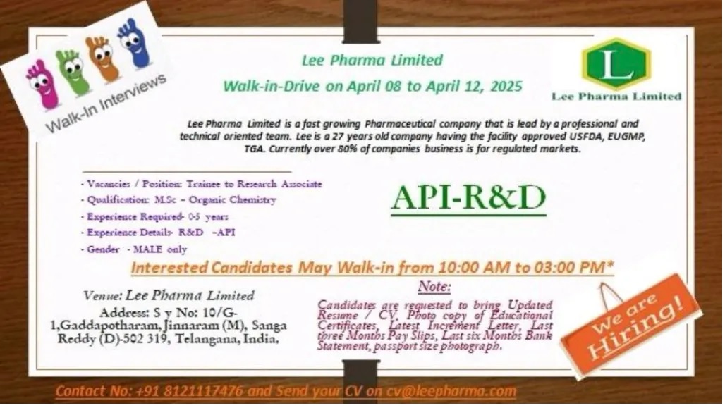 Lee Pharma Limited-Walk-In for R&D (API) from April 08-to April12, 2025
