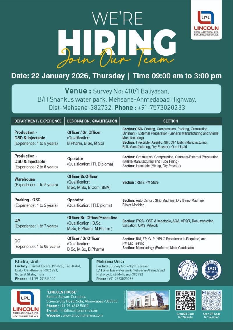 Lincoln Pharmaceuticals Ltd., Ahmedabad based 40 years old, public limited having presence in 75+ countries, 1700+ registered products, own Manufacturing and R&D center and among india’s top 70 pharma company.