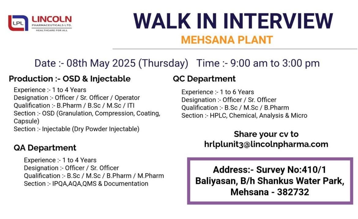Lincoln Pharma-Walk in Drive for M.Pharm, B.Pharm, MSc in Production, QA, QC on 08th May 2025