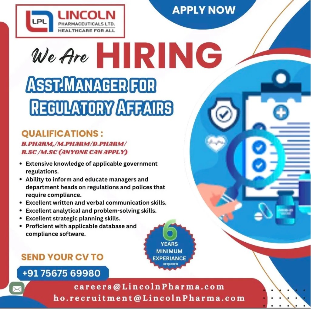 Lincoln Pharmaceuticals Ltd- Hiring for Regulatory Affairs Department Lincoln Pharmaceuticals Ltd- Hiring for Regulatory Affairs Department Post Views: 922 Job Category: Pharma Job Type: Full Time Job Location: Ahmedabad Apply for this position Full Name *Email *Phone *Cover Letter *Upload CV/Resume *Allowed Type(s): .pdf, .doc, .docxBy using this form you agree with the storage and handling of your data by this website. *