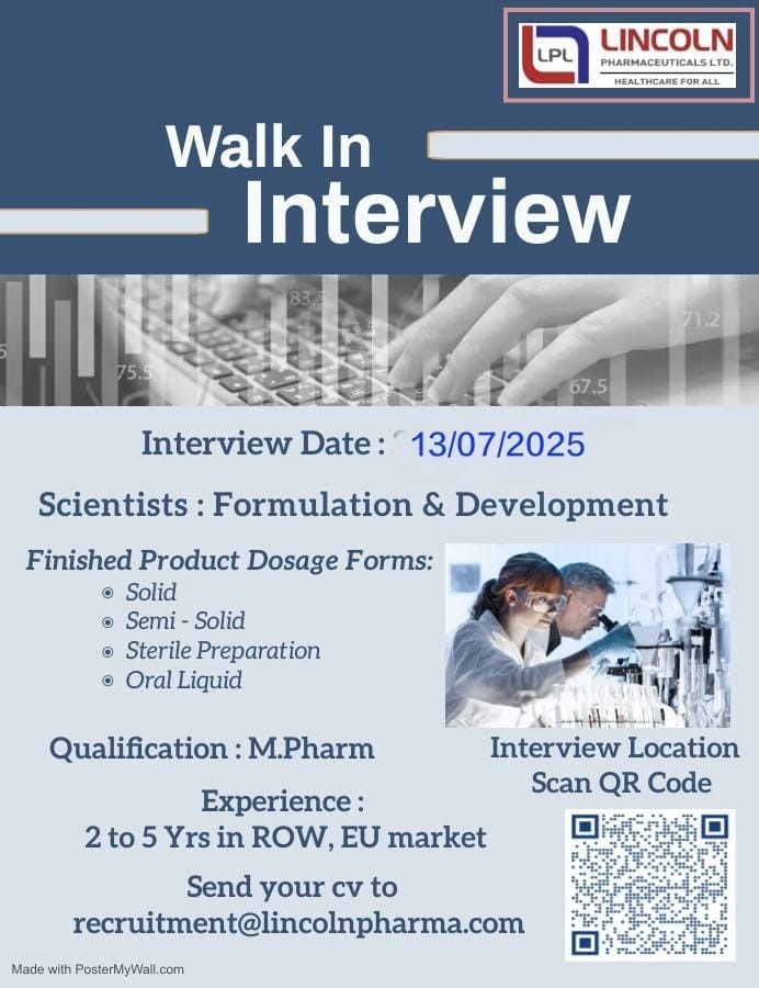 Lincoln- Walk-In Interview For Formulation & Development on13th July 2025 Lincoln- Walk-In Interview For Formulation & Development on13th July 2025 📍 Location: Details available Link Post Views: 251 Apply for this position Full Name *Email *Phone *Cover Letter *Upload CV/Resume *Allowed Type(s): .pdf, .doc, .docxBy using this form you agree with the storage and handling of your data by this website. *