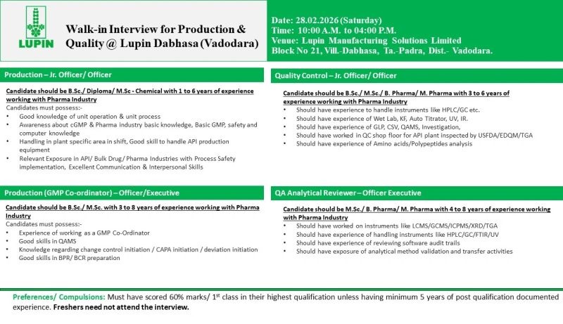 Walk-in Interview for Production & Quality @ Lupin Dabhasa (Vadodara)