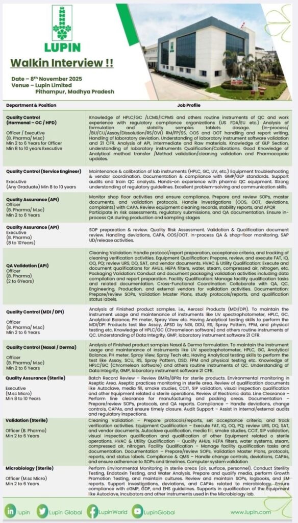 Job Profile : Batch Record Review – Review BMRs/BPRs for sterile products. Environmental monitoring in Aseptic Area. Aseptic practices monitoring in sterile area. Review of qualification documents like Autoclave, media fill, smoke studies, CCIT, SIP validation, visual inspection qualification and other Equipment related o sterile operations. Review of Electronic data. Line Clearance – Perform line clearance for manufacturing and packing areas. Documentation – Prepare/review SOPs, protocols, and QA reports. Compliance – Handle deviations, change controls, CAPAs, and ensure timely closure. Audit Support – Assist in internal/external audits and regulatory inspections.