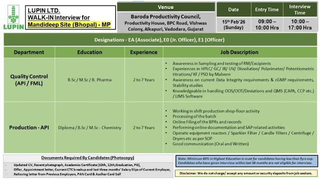 Lupin Ltd -Walk In Interview Quality Control & Production on15th Feb 2026
