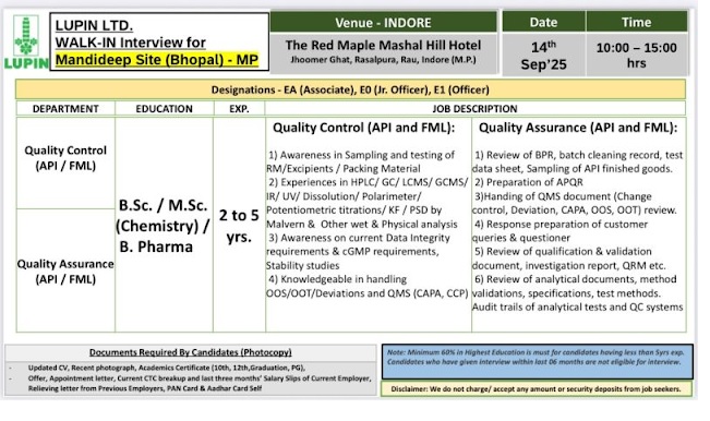 Qualification : BSc. / MSc. (Chemistry) / B.Pharma